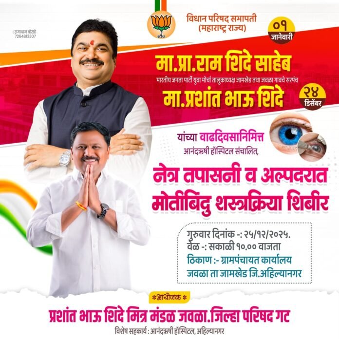 महाराष्ट्र विधानपरिषदेचे सभापती मा. प्रा. राम शिंदे यांच्या १ जानेवारी रोजी होणाऱ्या वाढदिवसा निमित्त तसेच भारतीय जनता पार्टी युवा मोर्चाचे जामखेड तालुकाध्यक्ष व जवळा गावचे मा सरपंच प्रशांत शिंदे यांच्या २४ डिसेंबर रोजीच्या वाढदिवसानिमित्त जवळा (ता. जामखेड) येथे भव्य, भक्तीमय व समाजप्रबोधनपर हरिकीर्तन सोहळ्याचे आयोजन करण्यात आले आहे. या उपक्रमामुळे संपूर्ण जवळा परिसरात आध्यात्मिक वातावरण निर्माण झाले असून भाविकांमध्ये मोठा उत्साह पाहायला मिळत आहे.