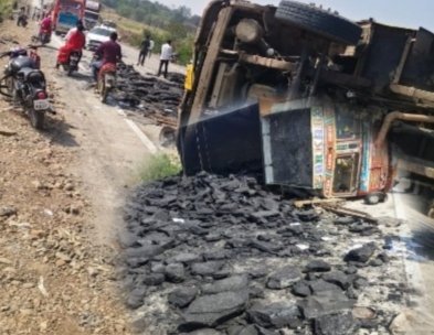 बराच वेळ रोडवर दगडी कोळसा पडल्याने रहदारीस अडथळा झाला होता शेवटी क्रेन आणि जेसीबी रस्त्यावरील गाडी बाजूला घेऊन कोळसा बाजूला सरकून रहदारी चालू केली आहेत.